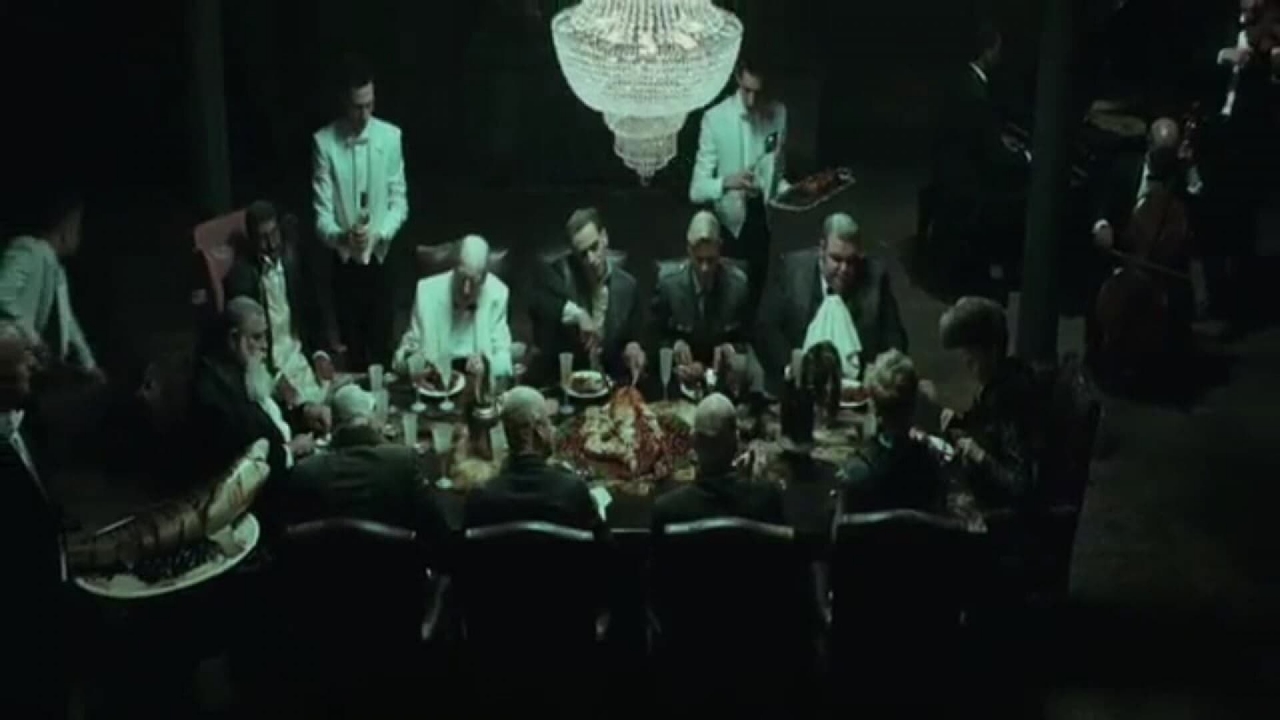 В роскошном, но безликом банкетном зале собрались одиннадцать богато одетых гостей. Они сидят за длинным столом, уставленным невообразимым количеством изысканных и экзотических блюд. Обслуживают их безупречные официанты в строгих костюмах. Атмосфера напряженная, церемониальная, лишенная обычных разговоров. Гости молча, с почти ритуальной серьезностью поглощают пищу.